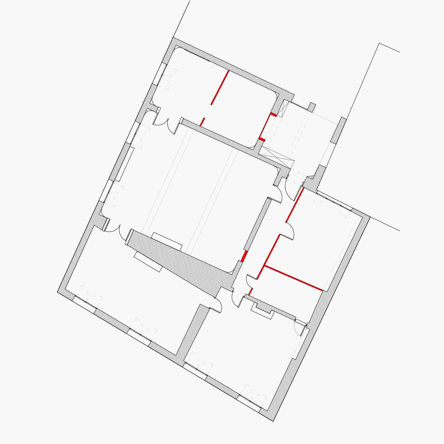 Le projet propose de réorganiser la circulation intérieure, en procédant à la réouverture de deux passages d’origine : la porte d’entrée historique, condamnée lors de la création d’une salle de bain qui est démolie, et le placard comblé entre le grand salon et le couloir d’accès aux pièces d’eau.